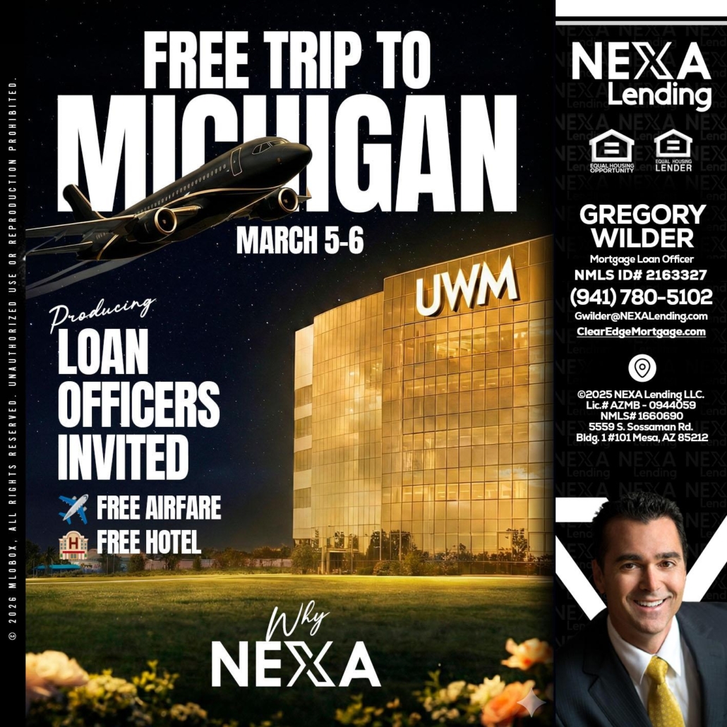 free Michigan trip - Gregory Wilder -Mortgage Loan OfficerHi, my name is Gregory Wilder. I’m a Loan Officer with Clear Edge Mortgage LLC Empowered by NEXA Lending LLC, offering personalized mortgage solutions, fast customized quotes, great rates and service with integrity.