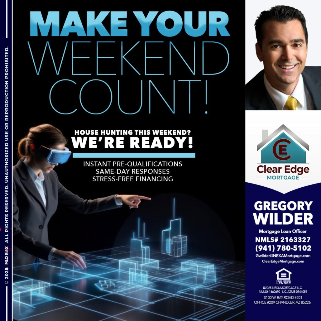 Hi, my name is Gregory Wilder. I’m a Loan Officer with Clear Edge Mortgage LLC Empowered by NEXA Mortgage LLC, offering personalized mortgage solutions, fast customized quotes, great rates and service with integrity.