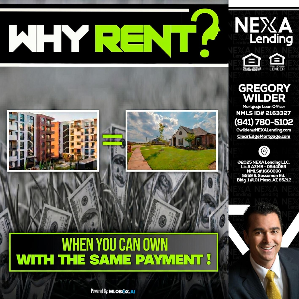 WHY RENT? - Gregory Wilder -Mortgage Loan OfficerAre you tired of renting? Are you tired of paying someone else’s mortgage but not yours? If Yes, then contact me and we can change that, starting today.